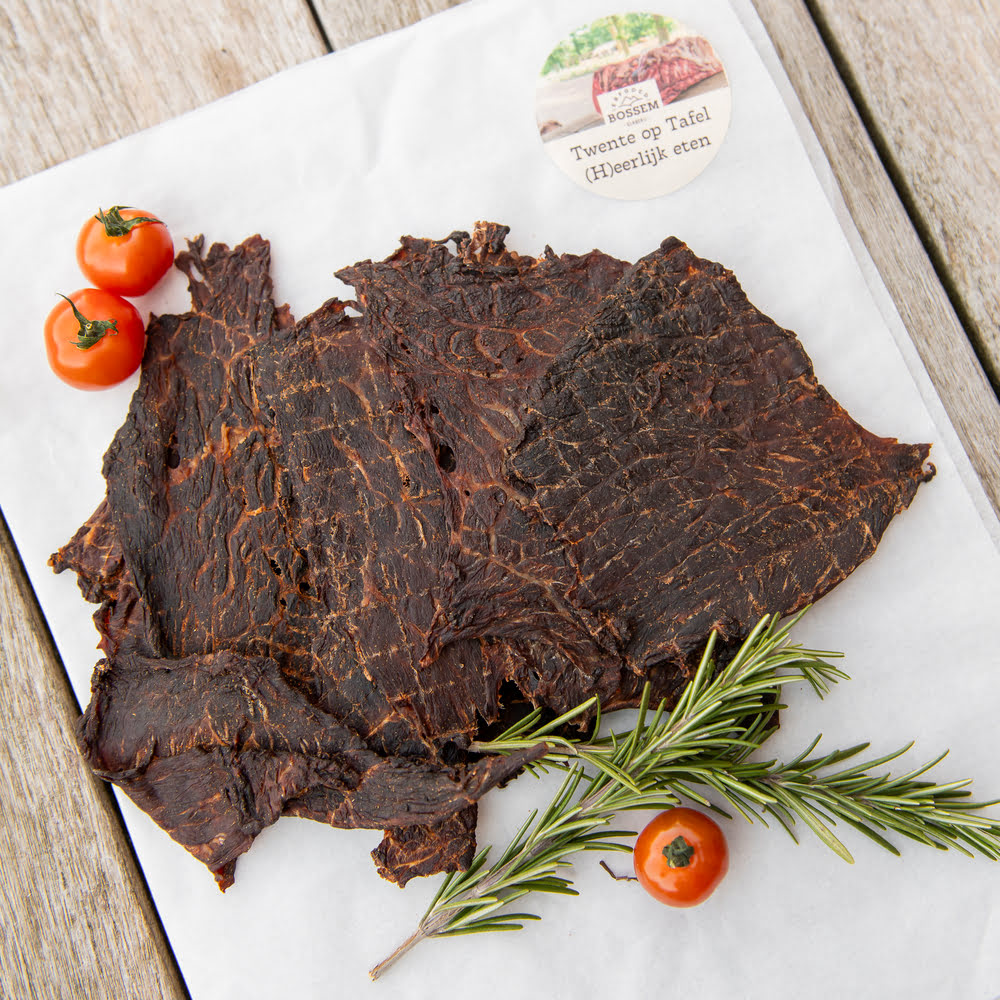 Onze beef jerky is ambachtelijk gemaakt van onze eigen Brandrode Runderen. Langzaam gedroogd, kruidig en vol van smaak (circa 100 gram). Deze snack is perfect voor onderweg, bij de borrel of gewoon als je zin hebt in iets hartigs.